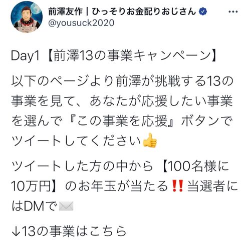 明けましておめでとうございます♂️ お年玉10万円プレゼント企画です。 私が? そんな訳ないじゃないですか お金を配っている前澤さんのイベントですよ 当然応募してみました。 当たらないかな〜 当たらないよね〜 だって、、、大したコメント書いてないんだ…